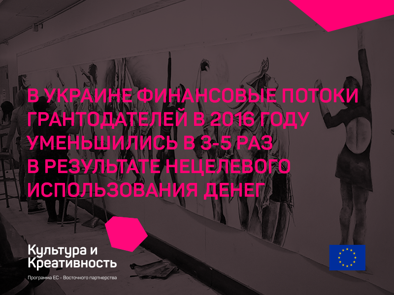 Этот способ финансирования кажется очень привлекательным, и средств, поступающих в Украину на реализацию социально-культурных проектов, сейчас действительно много. Но получить грант может только организация, и для этого нужен человек, который постоянно мониторит этот рынок, подает заявку, отчитывается. Сам процесс отчетности имеет много подводных камней и вообще довольно сложный, особенно если грантодатель – крупная международная организация или фонд. Поэтому рассчитывать, что финансирование проектов будет осуществляться только за счет грантов, не стоит, учитывая то, что денежные потоки грантодателей из-за их нецелевого использования в 2016 году уменьшились в 3-5 раз. Однако можно сосредоточиться на грантах, которые предоставляют местные фонды, они тоже есть, и работать с ними проще.